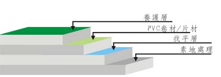 ①防水處理:一樓地面需做好防水處理; ②素地處理:打磨、清除顆粒、灰塵等雜物; ③找平層:滾一道水性封閉底漆,增強(qiáng)附著力,干燥后鏝一道自流平水泥,找平地面; ④貼PVC卷材/片材:把膠粘劑刷涂在PVC卷材/片材上,遵守晾置時間,進(jìn)行加壓膠接,然后處理接縫處,用膠焊機(jī)把焊條焊好接縫,并處理; ⑤養(yǎng)護(hù)層:清掃干凈,用水性蠟均勻涂敷在產(chǎn)品表面。