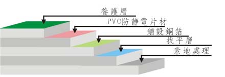 ①防水處理:一樓地面需做好防水處理; ②素地處理:打磨、清除顆粒、灰塵等雜物; ③找平層:滾一道水性封閉底漆,增強(qiáng)附著力,干燥后鏝一道自流平水泥,找平地面; ④鋪設(shè)銅箔:采用井字形鋪設(shè)銅箔,并做好接地處理; ⑤貼PVC防靜電片材:采用導(dǎo)電膠粘劑刷涂在PVC防靜電片材上,遵守晾置時間,進(jìn)行加壓膠接,然后處理接縫處,用膠焊機(jī)把防靜電焊條接好,并處理; ⑥養(yǎng)護(hù)層:清掃干凈,用防靜電蠟均勻涂敷在產(chǎn)品表面。